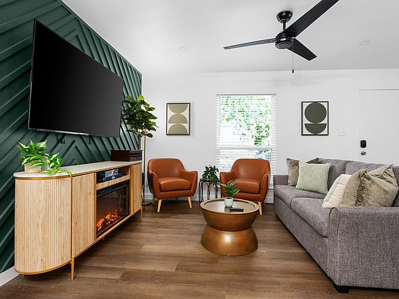 This unit offers a primary bedroom with a king bed and workspace, a bunk room with twin-over-twin bunks and workspace, and a queen sleeper sofa. There are two full bathrooms and two half baths across both units, with essential toiletries and in-unit laundry. The kitchens feature modern appliances, a coffee and tea bar, and cozy dining nooks. Living rooms include flat-screen TVs, electric fireplaces, and access to a fenced outdoor space with yard games, a BBQ grill, and a fire pit. We have 4 units available - A, B, C, D This property is available for long-term rent with a maximum allowance of two pets, subject to a pet deposit. Occupancy is strictly limited to the number of people specified in the lease agreement. The home comes fully furnished, offering convenience and comfort. Please note that utilities are not included in the rent.