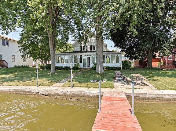 CHARMING VINTAGE THREE BEDROOM TWO BATHROOM CHAIN O'LAKES AND FOX RIVER FRONT HOME OFFERING 66 FEET OF WATER FRONTAGE WITH CONCRETE SEAWALL AND PIER. THE EXPANSIVE ENCLOSED WRAP AROUND PORCH FEATURES BEAUTIFUL MAPLE FLOORS, BEAD BOARD CEILING, HEAT AND CENTRAL AIR CONDITIONING FOR YEAR AROUND USE. THE ENCLOSED PORCH ALSO OFFERS POTENTIAL FOR ADDITIONAL BEDROOMS, HOME OFFICE OR DEN. FIRST FLOOR FEATURES KITCHEN, LIVING ROOM AND DINING ROOM ALL WITH HARDWOOD FLOORS AND AN UPDATED FULL BATHROOM. SECOND FLOOR HAS THREE BEDROOMS AND SECOND FULL BATH ALSO UPDATED. CEILING FANS IN EVERY ROOM. SLIDING GLASS DOORS OPEN FROM THE PORCH TO CONCRETE WALKWAY AND RIVERFRONT PATIO. COVERED PORCH MAIN ENTRY. TWO CAR DETACHED GARAGE AND ADDITIONAL PARKING FOR AT LEAST FOUR CARS OR TRAILER. BRING YOUR DECORATING IDEAS AND MAKE THIS CHARMER COME TO LIFE!