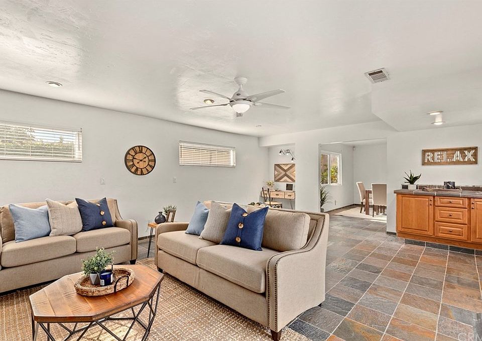 Look no further! This large cul-de-sac home is located in a sought-after area and features tons of curb appeal. Spacious double door front entry leads you into this turnkey two story, 4 bedroom, 2 baths home. The downstairs offers a formal living room, master bedroom with full bath, a dining room located off the remodeled kitchen, and a large family room with a slider to the backyard. Backyard fruit trees include: avocado, lemons, limes and tangerines. Upstairs offers an additional 3 bedrooms and 1 full bath. One of the over sized upstairs bedrooms is perfect for children sharing a room, a home office, craft room or man cave. Home also offers 3-car garage, newer windows, with plantation shutters. A tank-less water heater, solar and updated A/C. Conveniently located close to the 22 freeway, restaurants, shopping, and Disneyland.