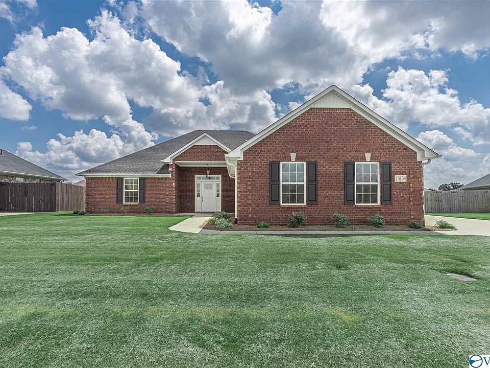 This gorgeous full brick ranch features an open floor plan with side 3 Car Garage, isolated Master BR w/trey ceiling and walk-in closet, glamour tub with columns, tile shower, water closet, and large double vanity. Great Room features custom trim, gas-log fireplace, hardwood flooring and 10' ceilings. Kitchen includes 10 ft ceiling, tile flooring, custom cabinetry, tile backsplash, large pantry, and granite countertops. Covered patio opens up to large fenced backyard. Convenient to Research Park and Arsenal area, minutes from Huntsville.