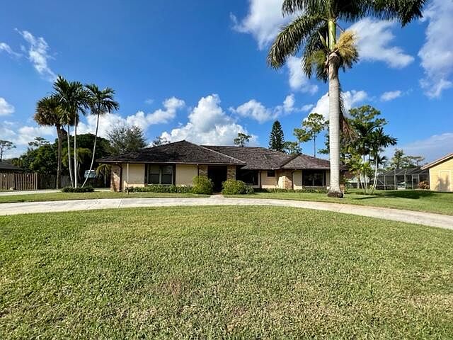 Highly desired Pinewood Grove on a half acre of land, no HOA and on a quiet street. This home is waiting for your personal touch. Circular driveway with extended side driveway that's large enough for an RV or Boat. New AC in 2021, newer Whirlpool appliances. Large covered porch leads to double door entry. Kitchen with an island, double oven and looks' out to spacious backyard. 31 x 14 back patio was enclosed for a bonus room. Plenty of room for a pool and summer kitchen to entertain. Generous sized main bedroom with his and her walk in closets. Both bathrooms feature dual sinks. Priced with updating in mind. Close to A rated schools, shopping, restaurants, equestrian/polo grounds and recreational parks.