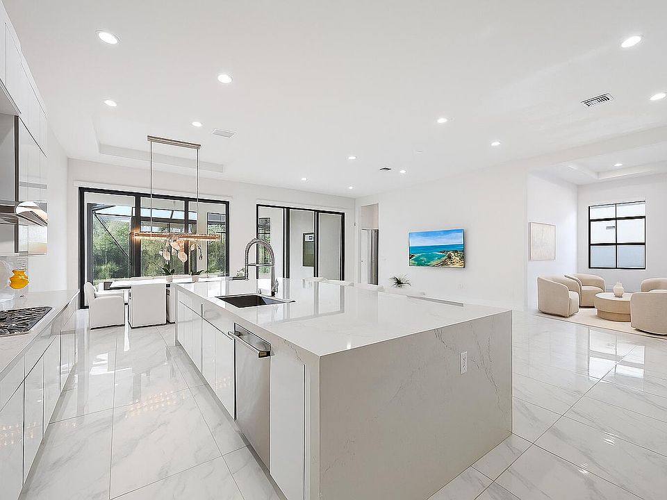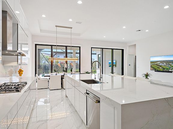 A sanctuary of balance and design, this one-level home spans over 3,000 SQ. FT. of living space with 3 bedrooms, 3.5 baths, and an oversized den or 4th bedroom. The grand foyer features 17-ft. ceilings, and 12 ft. throughout. Only one owner of this new construction home that closed in 2024. The kitchen's statement island anchors the space and the kitchen features a full quartz backsplash, acrylic touch-latch cabinetry, and GE Monogram appliances complemented by Restoration Hardware lighting. The serene primary suite features wood floors, a floating double vanity, soaking tub, walk-in shower, and views of the saltwater pool. California Closets and roller shades in all rooms; automatic shades in the master, great room and den. Outdoors, relax on the travertine patio with screen enclosure, artificial turf, and partial lake view that evokes a private resort ambiance. Artistry residents have a gated entrance and exclusive access to a contemporary clubhouse with fitness center, resort-style pool, basketball & bocce courts, and more. Benefit from A-rated schools and proximity to pristine beaches, upscale shopping, exquisite dining, and golf courses. A home this special won't last long.