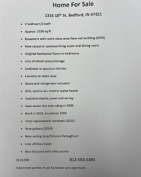 Move in ready with spacious rooms. Central air with GFA. Stove & fridge included. New light fixtures and ceiling fans throughout. New flooring in bathroom, laminate in kitchen, and new carpet throughout. Original hardwood floors in bedrooms. Low utilities and taxes. New gutters in 2019 and new out building with roll up garage door in 2020.