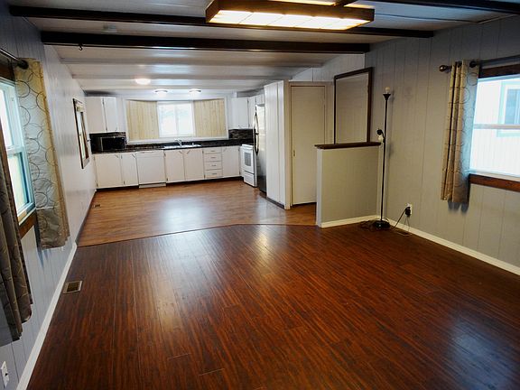 This is IT--affordable home ownership with NO LOT RENT. You will love your own large, fenced and private yard! From the new walkway, up the front deck, you'll find an enclosed entry with lots of space for coats, shoes--anything you need! As you enter the home, there is also a nice coat closet. You'll find a spacious open concept kitchen, dining and large living room. The kitchen features white cabinetry, pretty tile backsplash, a newer refrigerator and updated flooring. In fact, new paint and updated flooring is throughout the home. Down the hall you'll find three bedrooms and a full bathroom with nice updates and a laundry space--the washer and dryer stays! The roof of the house was resealed and the shed was shingled three years ago. The yard includes a shed and an oversized double parking pad for off-street parking.