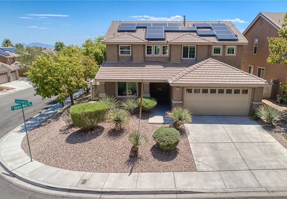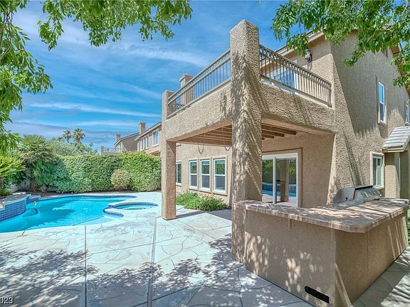 THIS IS THE HOME YOU HAVE BEEN WAITING FOR!!! This Summerlin stunner is located on a CORNER lot with a backyard OASIS that includes a POOL, SPA and built in BBQ! The interior of the home is light and bright and a great floorplan for living and entertaining. This 5 Bedroom home has a bedroom and a full bathroom downstairs and 4 bedrooms upstairs with a huge LOFT! The large primary bedroom is separate from the others, has vaulted ceilings and a balcony where you can enjoy the partial strip view! There is solid Pergo flooring throughout, all new paint, all new windows and sliders as well as PAID OFF TESLA SOLAR PANELS! California Closets installed in all the bedrooms and there is a Murphy Bed in one of the upstairs bedrooms. The kitchen has all stainless steel appliances (all included) and a large breakfast bar that leads into the family room which is perfect for entertaining. This home will not last long! Pack your bags!!! 3D tour & video in the virtual tour links.
