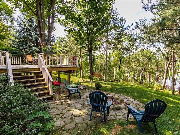 Welcome to your private retreat. Paradise meets warm and cozy in this 2 story home nestled among the trees. A one of a kind property that includes 387ft lakefront access w/stunning views from the upper deck & a gorgeous waterfront pavilion & dock. Many updates including ~ windows, flooring, appliances, ceiling fans & a newly finished walkout basement offering a large flex space, office & pellet stove. 1st floor master suite w/ fireplace, full bath & living room. Main area offers an open floor plan with a large kitchen, living rm w/ gas fireplace & dining rm. Plenty of storage, mud rm, 1st floor laundry and 2 car garage. Three 2nd floor spacious bedrooms w/ full updated bath. Multiple gardens and pathways add to the outdoor atmosphere. This is truly a unique property that you must see to appreciate.