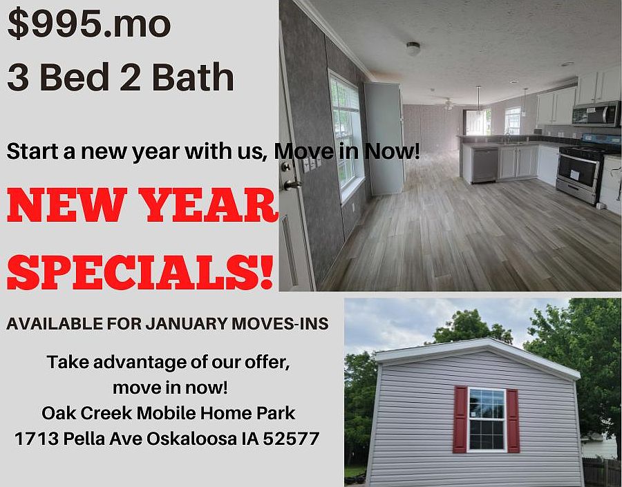 Time is running out. Move in before the end of January to take advantage of our new year specials! Your Brand New Home Awaits! Call now to move in! Brand new 3 bed 2 bath at $995/mo Comes with a full kitchen, stove, refrigerator, built-in microwave, and dishwasher! Small pets welcome up to 25pounds Experience living in this brand new home, Call now to move in! Located at Golden Arrow Mobile Home Park Mins away from a Bus stop, a shopping area with the mall, restaurants, grocery store, gas station, Ball fields and soccer fields, Beach Ottumwa water park, and Indian Hills Community College. Address is 1316 E Mary St Ottumwa, IA, 52501 Call now to schedule a tour.