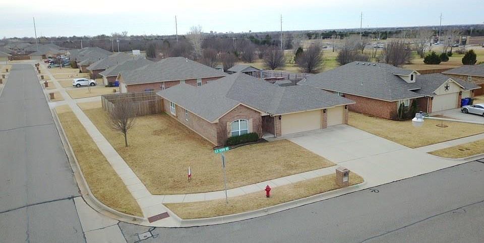 This is a 3 large bedroom, 2 bathroom home sitting in North Norman on an oversized corner lot. Brand new roof replaced in 2020. A beautiful energy star home with ceramic tile and gas log fireplace. There is an in-ground garage floor storm shelter in the 3 car garage. The sellers are willing to leave behind all the appliances including the washer/dryer and refrigerator and living room TV! 10 foot tall ceilings and a brand new security system with cameras. The neighborhood also has a park with basketball court, playground equipment, and walking trails around the pond. This home is the definition of move in ready, come see it today! Buyer to verify school district information.