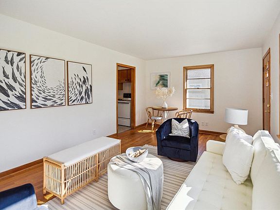 Stop scrolling, start owning this dreamy three bedroom ranch home. This updated and affordable gem is in a convenient location and offers more than just good looks. Imagine sunlight flooding through the expansive living room window, warming your mid-century modern sanctuary with original hardwood floors throughout. Whip up culinary delights in the modernized eat in kitchen with adjacent formal dining room, new kitchen floors and quartz countertops. Relax in the updated bathroom, featuring a new shower surround, mirror, LVP, a wainscoting accent wall and stylish vanity. Create in the spacious semi-finished basement, perfect for hobbies, entertaining and storage needs. Enjoy the endless parking and oversized backyard, free public transit access, and the convenience of your next-door neighbor - the bus stop! Bonus: Washer and dryer included, fresh paint and new lights! Call today to schedule a showing and make this functional house your lovely new home!
