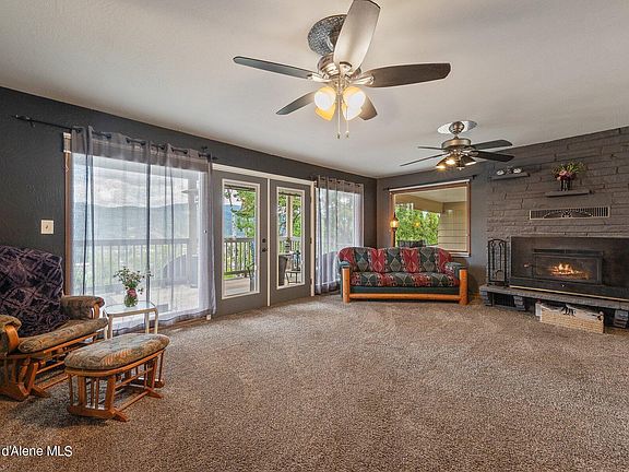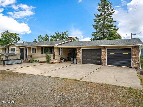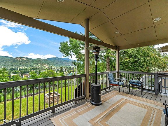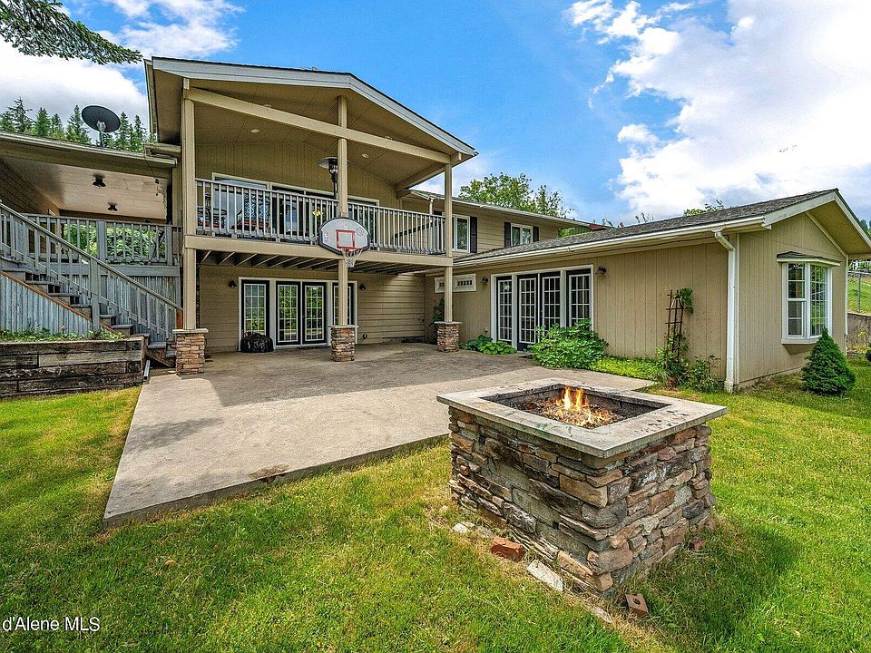Nestled just above the valley, this home offers breathtaking views from every window and outdoor living space. Generously sized with three bedrooms, two and a half bathrooms plus a massive master suite. True to North Idaho, you will find four heat sources - focal-point fireplace insert, pellet stove, and a newer forced air furnace - plus an outdoor fire pit just off the large stamped concrete patio. Main living spaces soak in the sunshine and the views, with french doors leading to the outdoors. The luxury master suite is complete with a flex room (think office, nursery, work out area), and large en suite with soaking tub, custom shower, and walk in closet. The kitchen is a vintage cutie, complete with walk in pantry and wash basin. A circular driveway, 2 car garage, and covered parking area provide plenty of room for vehicles, RV, Boat and all the toys.