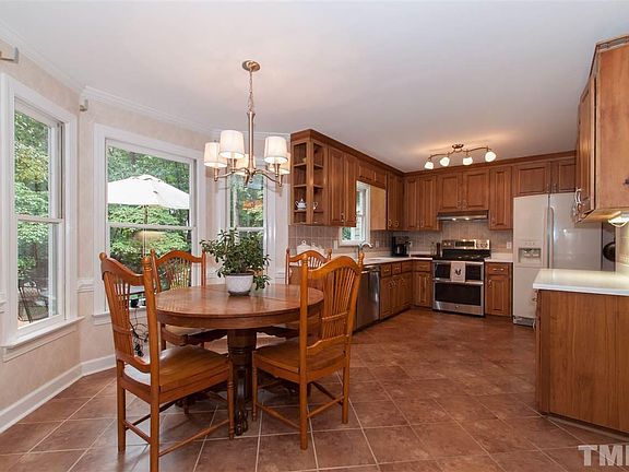 Outdoor entertaining, spacious & well maintained home in established N Raleigh location. Lovely hrdwd & tile flrs, formal living & dining rms, light & bright kitchen w/New Quartz counters, tile back splash & New SS appl's including Smooth Top Stove w/Double Oven. Family rm has wood burning FP w/ built-ins & access to Screened porch & large deck. Lrg Master bedroom has WIC & updated bath w/new dual Quartz topped vanity. Bonus rm w/wet bar & built-in entertainment center. 3rd flr Bonus rm & walk in storage!