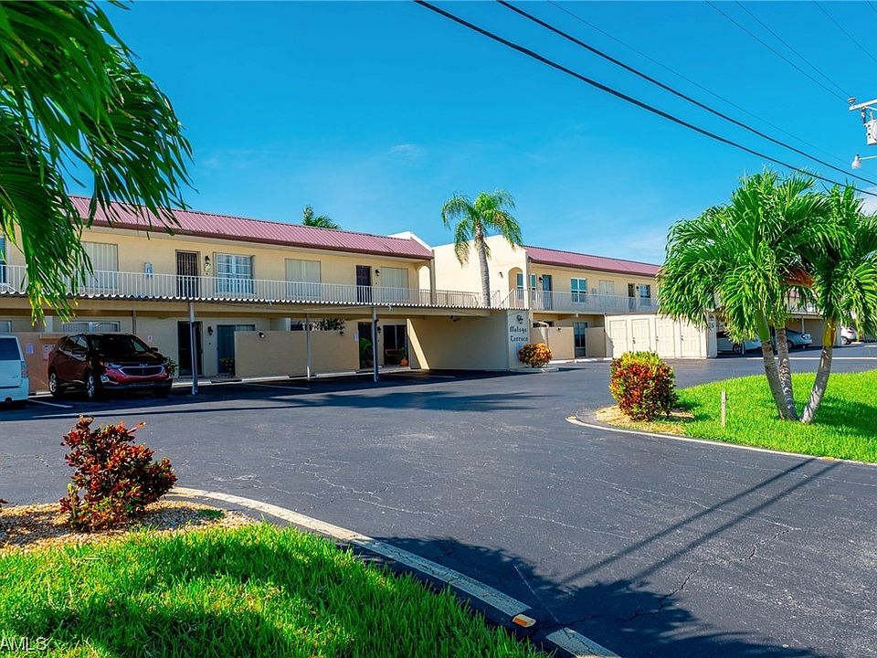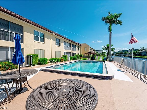 First Floor END UNIT. Being Sold Turnkey Malaga Canal Condo with dock spaces: 1 bridge to under 5 minutes to River/Gulf (SE Cape, Del Prado/Cape Coral Pkwy Area) Malaga Canal Bridge Height is: 8'9" Renovation work: Fresh Paint Throughout, New 6 panel Doors, New Carpet, New Bathroom Fixtures, New Kitchen Lighting and New Window Blinds. Move-in ready. This first-floor Condo is located around the corner from the Downtown restaurants and shopping and is a must-see. 2 beds, and 2 baths, with a lanai is approximately 1,213 square feet under the air. The property was built in 1977 and offers a large fenced community pool, deck, and grill area. Stable association and great people. • 55 and over Condominium (Residential). • 1,213 sq. ft. • 1 Parking space: Carport. • Dock Space. New stainless kitchen appliances• Granite countertops throughout •Hurricane shutters •