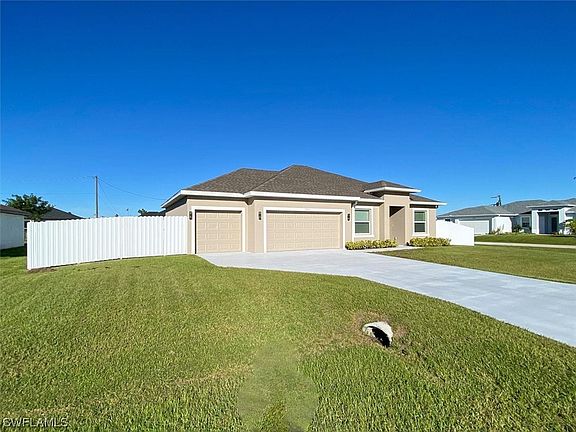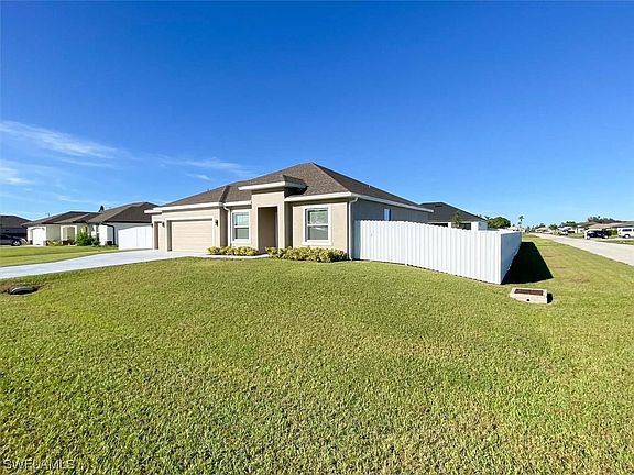 Welcome Home! This property is nestled in the heart of Cape Coral. This residence boasts a spacious split bedroom layout, blending comfort & contemporary finishes. Boasting 4 bedrooms & 2 bathrooms, this home provides ample space for families or individuals seeking a tranquil lifestyle. With a well-designed floor plan, offering a blend functionality & style, creating an ideal setting for relaxation or entertaining. Contemporary finishes throughout including porcelain marble look tile, White Shaker style kitchen cabinets & Quartz w/waterfall edge finish updated LED lighting & Stainless-Steel appliances. Primary bath has dual sinks & ample shower. Fully Fenced in yard to enjoy the beautiful Florida weather with plenty of room for a pool. A 3 car Garage has an extra deep 3 bay w/room for up-to 4 cars OR ALL THE TOYS. This property offers the perfect balance of comfort & sophistication. Enjoy the charm of the surrounding neighborhood, known for its serene parks & convenient access to a variety of local amenities; including boat launch w/parking close to schools & other essential facilities, making it an ideal choice for those looking to enjoy the best of what the Cape has to offer.