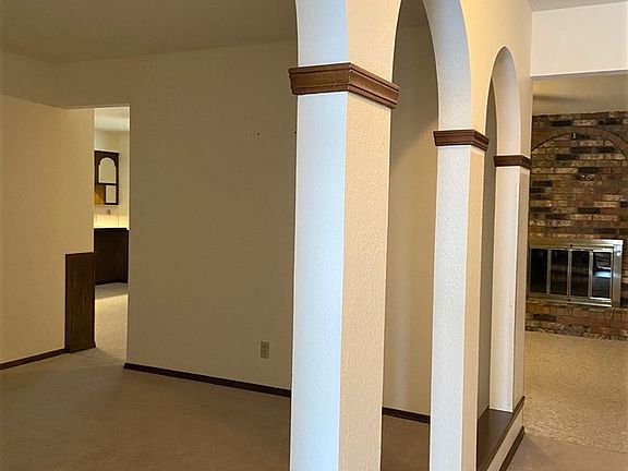 This home features an arched them with open archways. Formal dining or a 2nd living area with draped arch window. The open living/kitchen area has arched shelving adjoining the brick fireplace. The exterior door leads out to a covered patio area. The kitchen has wooden cabinets, ceramic back splash & pantry with utility area adjacent. Recently painted soft textured walls throughout. Closet & storage in hallway. Master BR has walk-in closet, bath w/ single vanity & step in shower.