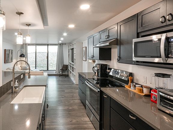 Large lawnCozy luxury feelGround floorMinimalist and efficient designBack patioGrey stone countersNew black cabinetry