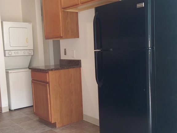 AVAILABLE NOW - 2 Bedroom, 1 bathroom ground floor condo unit in 4 plex, around back from front of building - Unit has carpet throughout, with vinyl in kitchen and bathroom - All black appliances with refrigerator/freezer, range/oven, dishwasher, microwave - Wall unit A/C in living room only - Stacked washer and dryer included - 1 off street parking spot - Detached one car garage for STORAGE ONLY, cannot fit a car inside ** There is a $50 utility fee for water, trash, and yard care. ** Tenant pays electric and gas ONE small to medium dog only for a $600 nonrefundable pet fee. NO CATS, BIRDS OR FISH. ** We offer online rent payments via our website or automatic bank to bank ACH service. ** Information in advertising deemed reliable but not guaranteed. **