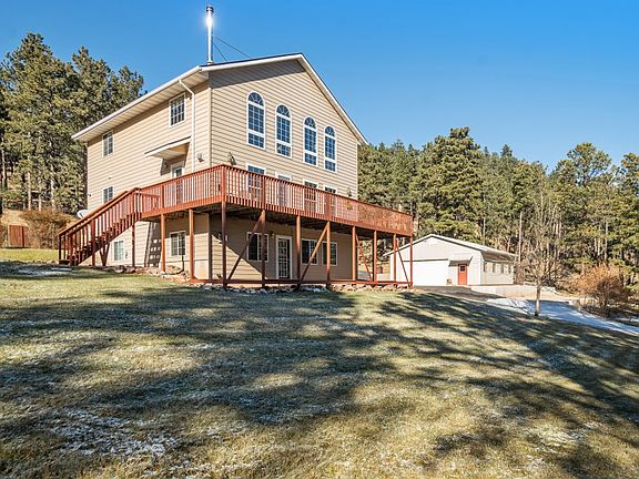 Listed by Shauna Sheets, KWBH 605.545.5430. Enjoy life among the pine trees in this beautiful home on 6.54 acres! Offering beautiful details in the oak cabinetry with crown molding, custom tile work, sandstone tile flooring, soaring vaulted ceilings, large windows and more, do not miss this one of a kind home! The main floor is perfect for entertaining, with a generous kitchen as the heart of this home. An appliance suite with double ovens, ample cabinet and counter space and a walk in pantry makes this kitchen a dream! The nearby living room is accented by a wall of windows, providing views of your private oasis from many vantage points. A main floor guest bedroom offers an ensuite bathroom and private outside access. The master retreat is on the upper level with a private balcony, sizable bedroom, walk in closet and an oversized four piece bathroom with corner soaker tub. One additional bedroom and a loft space that overlooks the living room complete this level. The walkout basement offers a cozy family room with corner fireplace for added warmth and comfort. Three good size bedrooms and one bathroom complete this level. Outdoors offers a large wrap around deck with many access point, a covered patio space, a 36'x30 garage with insulated shop area, mature fruit trees, and more. Bordered by USFS, this private retreat awaits; call to see today! *5th bedroom- 15'x9', 6th bedroom 11'x9'.