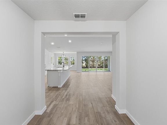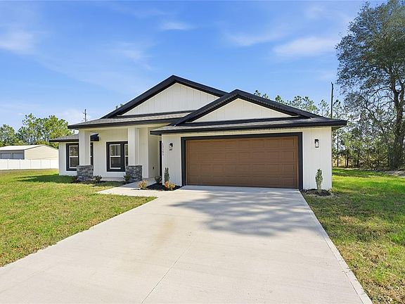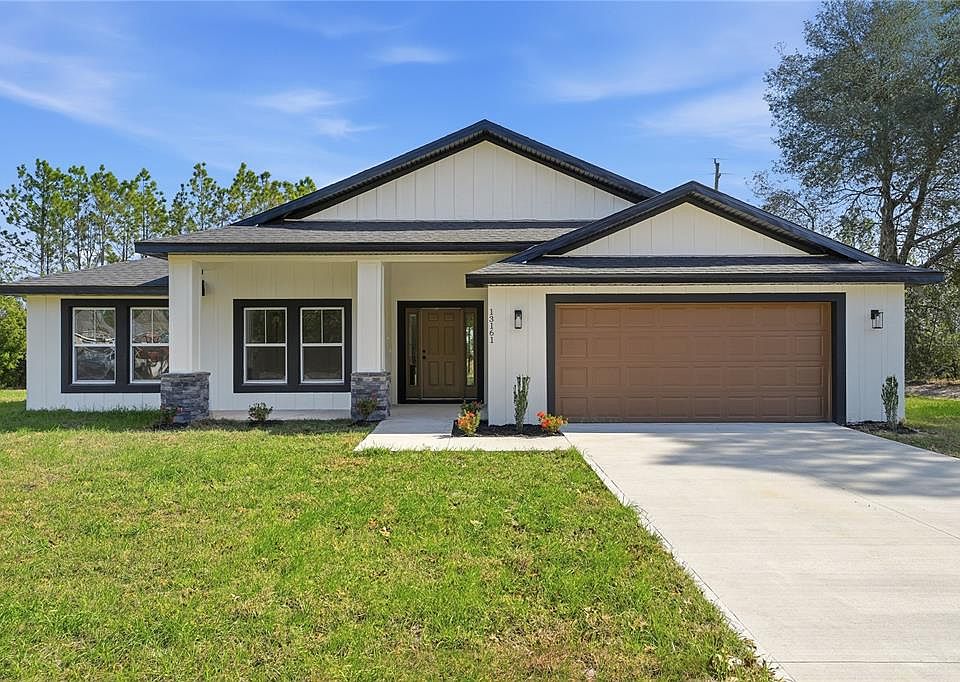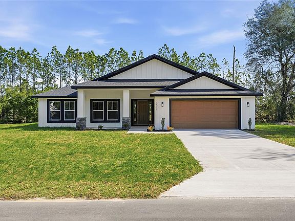 Welcome to this beautifully crafted, modern single-story home on an oversized corner lot with timeless curb appeal, and a peaceful setting. This 4/2 BRAND NEW residence offers an open floor plan, split bedrooms for privacy, and meticulous attention to detail throughout. Elegant tile flooring flows throughout the home, complemented by sleek black plumbing fixtures, lighting, and door hardware. The kitchen features solid wood cabinetry and granite countertops, while an inside laundry room adds everyday convenience. The owner's suite features a spacious walk-in closet, and the bathroom boasts a separate glass-enclosed shower along with a freestanding soaking tub. Designed for both comfort and entertaining, the home offers two covered porches, a large sliding door off the great room, and a dedicated dining area with porch access. The expansive backyard provides ample space for outdoor living and gatherings. Ideally situated with easy access to shopping, dining, major highways, and nearby state parks.
