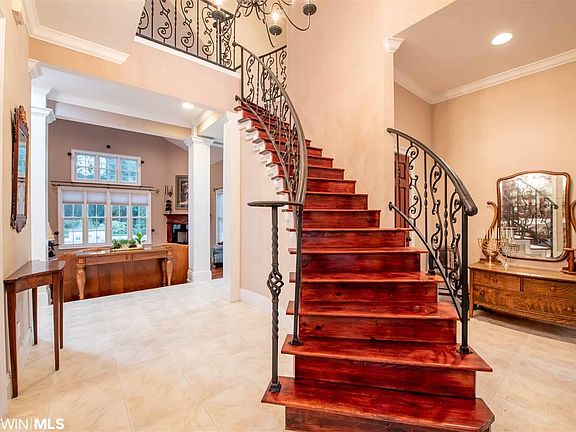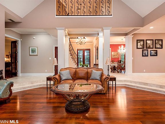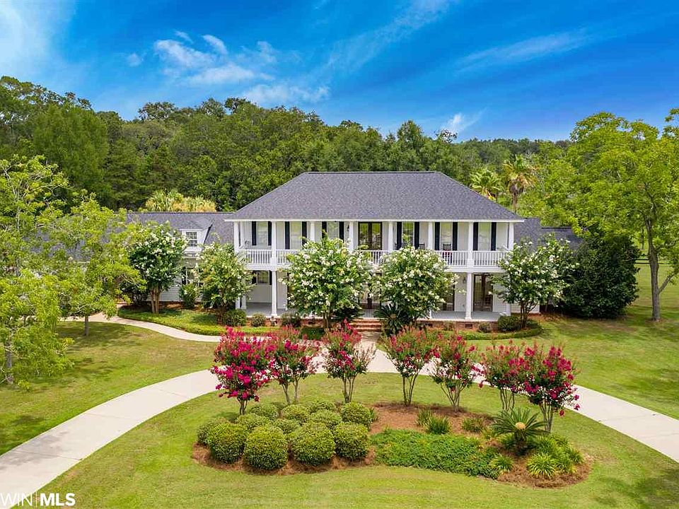 Quintessential Southern Charm! This beautiful custom-built home is located in Fairhope's sought-after Dominion Farms neighborhood. Sitting on just over two acres of land with a Grand Live Oak tree, this home gives you space and privacy. The property is adjacent to a portion of the 30 acres and 3 stocked ponds of the community common ground, giving you just one next door neighbor. Beautiful and fragrant landscaping. Sprawling front porch with 6 sets of french doors provide an abundance of natural light throughout the home. Through the threshold, you are wowed by the sight of the grand curved staircase and a view straight back to the water feature in the pool. Attention to detail is seen everywhere as you continue into the home. Beautiful iron work, 12 foot ceilings, 8 foot doors, and stunning trim work are just a few of the highlights. From the foyer, you can go straight forward into the sunken living room, or to the left to the formal dining room. The floor plan flows easily for both entertaining, with a half bath off the foyer, as well as daily life, with the Master Suite on the main level. Most every room beckons you to enjoy life in the stunning back yard with three separate covered back patios, all overlooking the gorgeous gunite pool. Upstairs are three bedrooms, a full bathroom, a catwalk overlooking the living room, foyer, and pool that also leads to the front balcony. Attached guest quarters/pool house/optional 5th bedroom/home office/playroom/flex space, has the functionality of a mother-in-law suite with a kitchenette, full bathroom, and separate front and back doors. A portion of this space is currently being used as a home gym. Easy commute to both Mobile and Pensacola, 5 minutes to the boat launch, 35 minutes to the beach, 20 minutes to Downtown Fairhope shopping and dining, this home is in optimal location for experiencing gulf coast life to the fullest! 3 car garage. New Roof and pool pump both replaced in April 2020. $5k flooring allowance