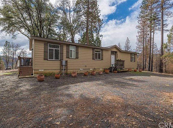 This well maintained 2012 Manufactured Home sits on 3 acres & commands a beautiful view of Concow Lake & Surrounding Mountians. The new owner will love that a new 2019 WELL has been completed! The exterior is cement board siding, it rests on a concrete foundation, and it has a great stamped and colored concrete patio and walkway. The interior is outstanding w/ an Open Floor Plan, 11Ft. Ceilings throughout, large picture windows w/ transoms & updated Laminate Flooring in every room. The kitchen is spacious & open w/ tons of wood cabinets, lots of counter space, a double stainless sink, a propane oven/range, & a huge center island that includes a vegetable sink w/ disposal. Like most every room, the master bedroom has a view of the lake & forest & includes a large walk-in closet. The master bath offers a 2-sink vanity w/ a makeup counter in between & a large, floor-to-ceiling tiled, walk-in shower. The guest bath offers a tub/shower combination. The utility/laundry room includes space for a stackable washer/dryer & room for a refrigerator or freezer. The guest bedroom has a separate entrance to the side yard. The third room is currently used as an office w/ a bookcase built into a nook & could potentially be the third bedroom. Lastly, it has Forced Air Central Heat and Air Conditioning. If you're looking for a turn-key ready home, look no further. Call today for more information.