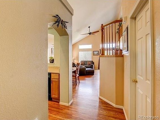 Welcome Home! This 3 bedroom 3 bathroom home with loft features Hardwood floors, upgraded lighting and fixtures throughout the home, eating space in the kitchen and main level Master bedroom with private bath-glass enclosed shower with custom time, backsplash and tile flooring. Upstairs you will find two more bedrooms plus a loft. Step outside to the professionally landscaped back yard with custom pavestone patio and retaining wall. 2.5 car garage and across from Trail Winds park and open space. This home has been exceptionally well cared for and it shines through. You will love it!