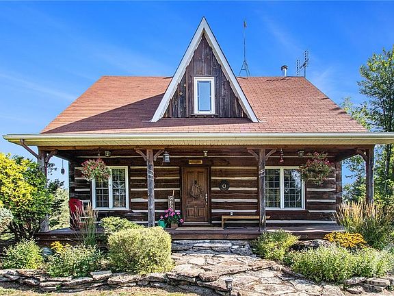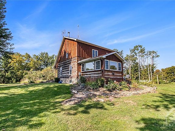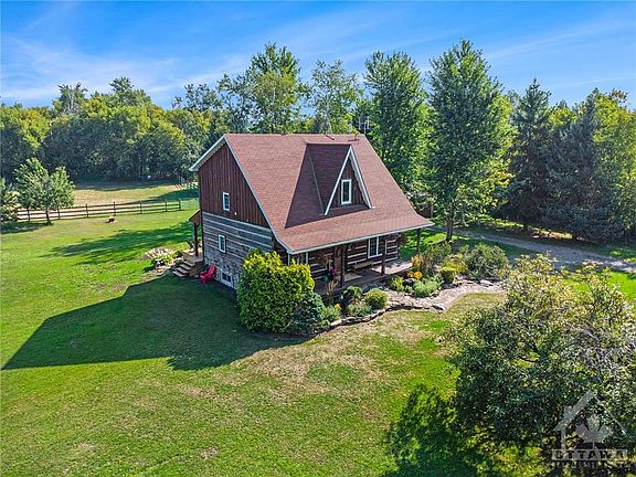 Welcome to this breathtaking HOBBY FARM! Discover rustic charm and modern comfort in this beautiful log home on 24.75 acres in Mountain, Ontario. Inside, log beams, granite counters, wide plank and hardwood flooring create a warm atmosphere. Enjoy cozy evenings by the wood stove and prepare meals in the kitchen in an elegant open concept environment with adjoining extension with plenty of windows that flood the space with natural light. The upper primary suite boasts a spacious ensuite with a luxurious tulip tub and walk-in closet. I the freshly finished basement (2022) offers numerous options to suit your needs & where you will find the sauna! This property offers more than just a stunning home. Scenic trails, pasture, riding ring & barn with 3 box stalls for your 4 legged family members. Enjoy magnificent sunsets out front or magical sunrises on the rear porch with your morning coffee. Your ideal hobby farm awaits, just 15 minutes northeast of Kemptville & 30 minutes south of Ottawa.