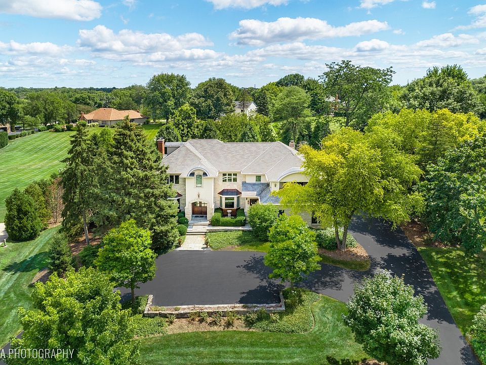 Welcome to this exquisite home set in desirable Inverness Shores, offering over 5,000 square feet of beautifully updated living space. As you step through the arched double doors, framed with elegant stone accents, you're greeted by a sweeping two-story foyer with a custom carved staircase. Formal living and dining rooms flank the entrance offering the perfect setting for sophisticated entertaining. The heart of the home opens into an expansive, light-filled family room, kitchen, and sunroom with breakfast area, designed with the modern lifestyle in mind. The gourmet kitchen is a chef's delight with tiered island, breakfast bar, granite counters, custom cabinetry, walk-in pantry and high-end appliances that make meal prep a breeze. The adjacent family room, anchored by a dramatic floor-to-ceiling stone fireplace, invites cozy gatherings and seamless indoor-outdoor living with sliders to the bluestone patio. The sunroom is bathed in natural light with vaulted ceiling, skylights, and walls of windows offering panoramic water views. An additional breakfast bar and wet bar complete this perfect gathering space. Offering a unique blend of luxury and charm, the breathtaking gothic library will leave you in awe. With soaring 12-ft ceilings, gas fireplace, custom built-ins, access to the hall bath and French doors leading to another blue stone patio, this room is a dream come true. A balcony overlooks the space, creating a cozy reading nook. A first-floor bedroom is ideal for guests or multi-generational living, with its own private bath rough-in, offering flexibility for future customization. The expansive mudroom adds both function and style with plenty of storage for daily essentials. Upstairs, retreat to the tranquil primary suite featuring vaulted ceilings, stunning lake views, and a spa-like bath. Three additional bedrooms, all with walk-in closets, provide ample space, including a private loft in the third bedroom and a versatile fourth bedroom that can double as a bonus room with its own private balcony. The second floor also offers an office space with access to the library's reading nook, hall bath, shared ensuite bath, rear staircase and a convenient laundry room. The full basement has been partially finished with den and wine cellar and awaits your creative vision to create the entertaining space of your dreams. Set on nearly an acre of lush, manicured grounds, you can enjoy the ultimate in privacy and serenity with blue stone patios, a fire pit for evening gatherings, and stunning water views from every angle. With a three-car garage, easy access to downtown Barrington, Metra, and award-winning Barrington D220 schools, this home offers the perfect blend of luxury and convenience.