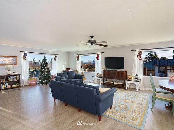 Charming spacious single level home with amazing views of Mt Baker, the Cascades and the Bay area! Entertain in the spectacularly huge living/dining area w/beautiful wood laminate floors. Open kitchen features eating bar, stainless steel appliances. 3 bedrooms includes built-in closets, bath with travertine and walk in shower. Large windows to enjoy the view and overlooking garden. Laundry room has lots of storage and shelving. Patio door opens to beautiful wrap around deck, raised garden beds, fruit salad trees, new large shed, and chicken coop. Extra parking lots of yard space complete with apple tree in the back. One block from elementary school and walking distance to middle and high schools. Close to hiking trails!