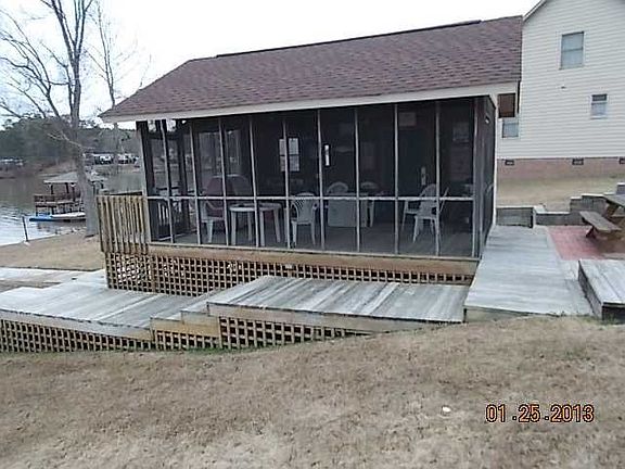 Custom built low-country style home on a nicely sloping lot with dock, boat ramp retaining wall. Home features hardwood floors, ceramic tile, carpet in bedrooms, custom oak cabinets in kitchen with granite countertops, surround sound system in great room, masonry fireplace with gas logs, vaulted ceilings, in-law suite, finished room over garage, large laundry/mud room with utility sink. Exterior features large wrap-around front porch, patio, large basement area for storage with bath area, large screened picnic/cook shed, boardwalk to dock, dock with gazebo and floating section, boat ramp and retaining wall.