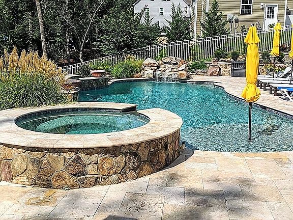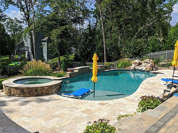 STUNNING RESORT-LIKE BACKYARD OASIS w/ rock waterfalls, fire bowls, pool & spa!! Beautiful landscaped property throughout. The entire backyard is fenced. Feel right at home in this 6-bedroom, 5 bath beautiful home, complete w/ partially finished walk-out basement to the backyard oasis. Featuring two-tier Tennessee fieldstone pavilion & paved stone patio w/ outdoor kitchen gas line hookup. This home features a spacious master suite w/ sitting room. The gourmet kitchen is perfectly finished with 42" cabinets, granite countertops, island bar w/ seating, stainless appliances, deck off the kitchen & hardwoods throughout 1st floor. The bonus room is on the 2nd floor and the 3rd floor media loft gives this home a recreational yet comfortable feel. This community boasts the following amenities: The Mill Clubhouse, 2 pools, waterslides, 2 playgrounds, 2 fitness centers, tennis courts, and an extensive system of walking trails throughout the meticulously landscaped neighborhood. A must see!