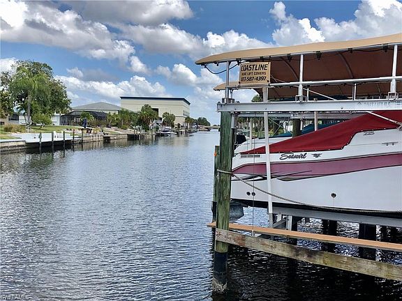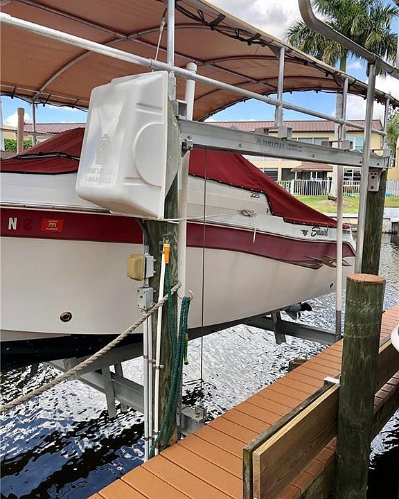 Boaters dream! Community access...A short ride to the Caloosahatchee River and your own private boat dock with lift with canopy. Boat dock is right outside your back door. Has electric and a water bib close by. Would be easy to cruse to catch-a-mess then bring back & clean'em. Great view of the Pool and Canal also has an extra large lanai that opens up to the Pool area. Includes separate outdoor locked storage room. This condo is one of the largest at 1703 SqFt under air. This is a well kept and well funded condo association with ample reserves and a condo fee that is only $975 per quarter that includes water and sewer too! This Condo is located in the very popular downtown South Cape and is walking distance to dining, shopping and a Farmers Market. A 55+ community. I have found this to be a very friendly community. Most residents like to hang out by the pool and socialize