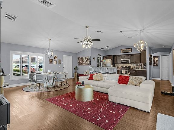 This beautifully maintained 4-bedroom, 2-bathroom home is centrally located in the highly desirable SW Cape Coral area, near Palmetto Pine Country Club Golf Course and within walking distance to some of the top school in the area. The home features a spacious open floor plan with vaulted ceilings, vinyl flooring flows throughout the entire house except vet area, and elegant plantation shutters throughout. The living room seamlessly connects to a well-appointed kitchen with showcasing sleek granite countertops, a matching granite backsplash, and modern stainless-steel appliances. The bathrooms are equally impressive, featuring luxurious granite countertops and dual vanities. The highlight of this property is undoubtedly the large heated saltwater pool and a luxurious spa. The impressively large brick paver lanai area is perfect for relaxation and gatherings. The backyard is fully fenced in, guaranteeing privacy and making it perfect for kids or any of your furry friends. A standout feature of this home is garage, with a split AC unit, insulation on garage door and epoxy flooring. The home is serviced by city water and sewer, with small balance of assessments. New metal roof – 2023. FLOOD ZONE X500 – No flood insurance required! This move-in ready home with thoughtful upgrades is a true gem in the heart of Cape Coral. Don’t miss out on this exceptional opportunity!