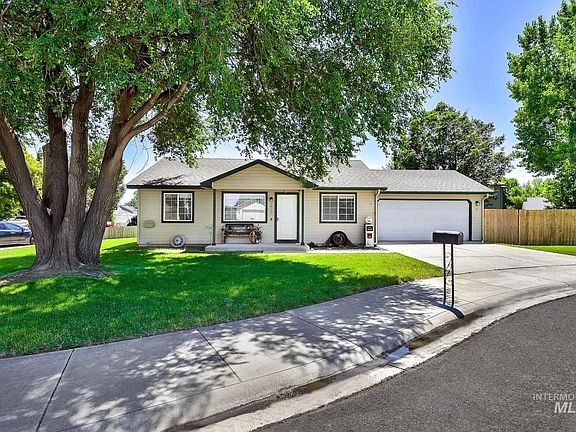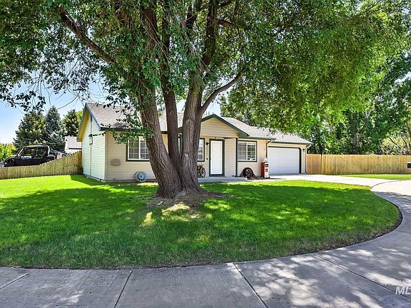 Nestled in a quiet cul-de-sac just steps from Indian Creek and the greenbelt, this charming single-level home offers serene Kuna living. The interior was freshly painted and features three bedrooms and two full baths within a cozy 952 sq ft footprint. Positioned on a generous .24-acre lot, the property boasts mature shade trees, a large backyard, and a spacious patio complete with firepit—ideal for outdoor entertaining. Additional highlights include RV parking and a two-car attached garage wired for 220volt. Enjoy morning walks along the water or a peaceful retreat near the heart of town in this well-maintained, move-in-ready home.