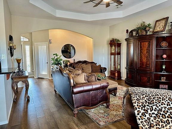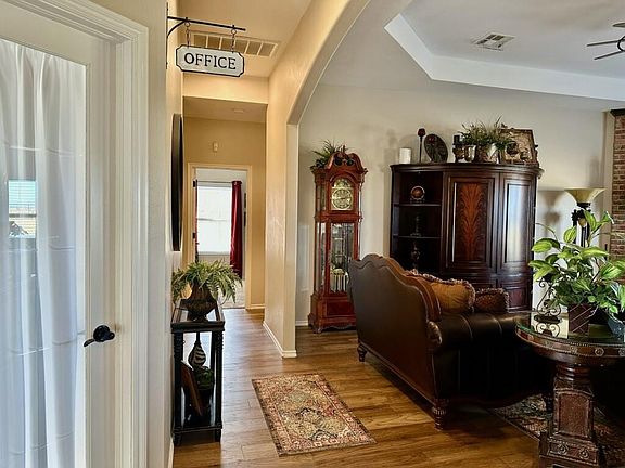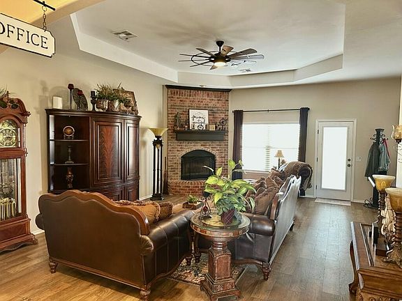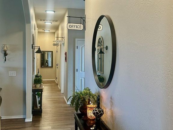 with lawn mower and safe. Updates include wood flooring, updated lighting throughout, plumbing fixtures, blinds, landscaping and patio extension. Roof was replaced in 2020. Enjoy the outdoors under your covered backyard patio and large backyard that backs to neighbor's hay field, ideal for relaxation and family gatherings. The property also features a water softener, a new water heater and a storm shelter for peace of mind. This wonderful home is situated on a 3/4-acre lot with easy access to Hwy 74 making commuting a breeze. Don’t miss your chance to make this beautiful property your own!