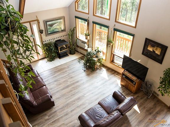 Black Hills Living! Only 7 miles from Rapid City, this home features 3 Bedrooms, 2.5 baths, 3 car garage, 2500 sq. ft., and almost half of an acre! The interior offers plenty of light with the open design concept and floor to ceilings windows that give you that Southern Exposure view! Newer flooring recently installed in the living room, kitchen, dining and main floor hallway. The main level features a gas stove, two doorways leading to the deck, two bedrooms, and an additional 16x22 room that offers you a variety of options. Main level bath was recently remodeled with tile flooring, paint, and vanity top. The upper level features the Master Bedroom and Bath, with a large walk-in closet, and a walk way that looks down into the Living and Dining area. Lower level has a walk-out to the east lower level deck, a half bath, 28x16 family area with a pellet stove that sits in front of a slate rock wall. Tandem two car garage, plus an additional garage space and workbench.