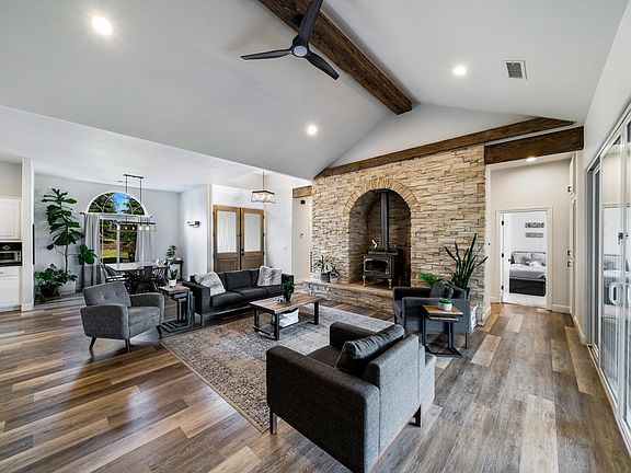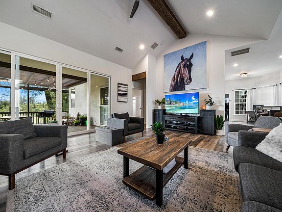COMPLETELY RENOVATED, this home shows well! From the 8' double-door entry to the Vaulted Ceilings in the Great Room with Wood Beams, Stack-Stone Fireplace surround, MOUNTAIN VIEWS, open-concept kitchen layout with Granite Counters, floor-to-ceiling cabinetry, Commercial-Sized Refrigerator, Stainless appliance package, Split-floor plan with Private Master Suite, Double-sided fireplace from bedroom and Jetted Tub, 2 walk-in closets, separate walk-in shower, sitting area and access to back deck. 10' ceilings throughout. Laundry Room with built-in cabinetry. 3rd Bath makes it easy for many guests or larger family. The 5th Bedroom and 4th Bath is upstairs and has access from the home or separate entrance. Could be Guest, MIL, or income potential. POOL + Hot Tub (see video).