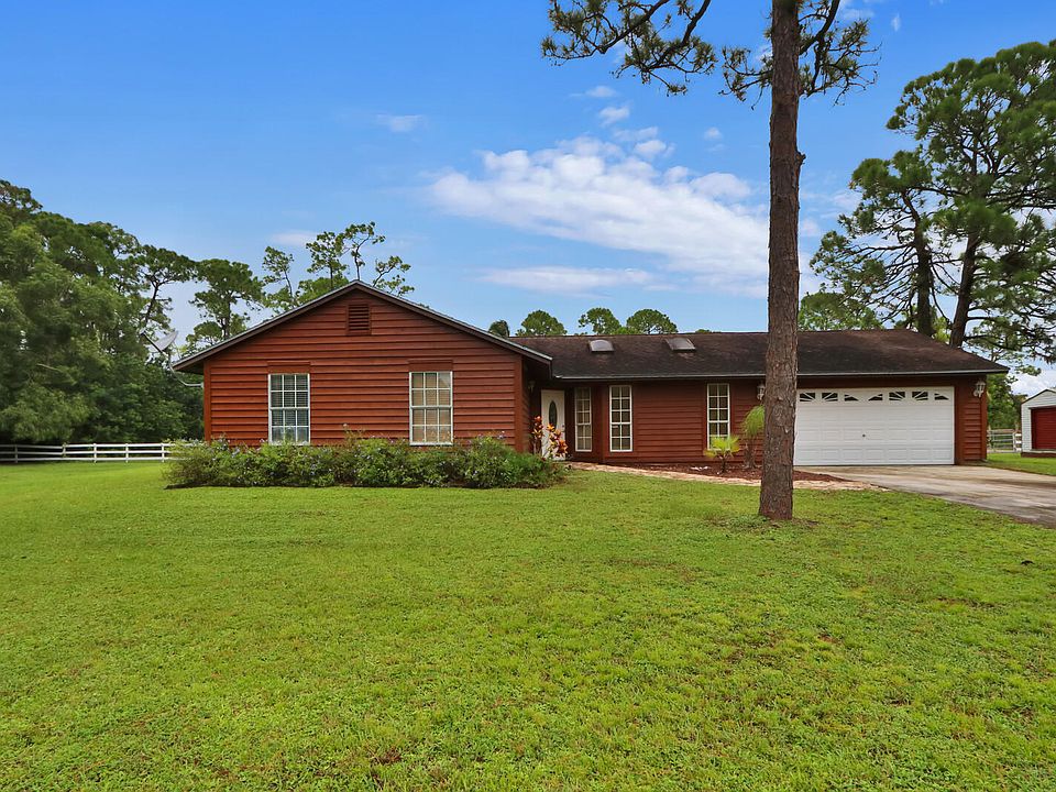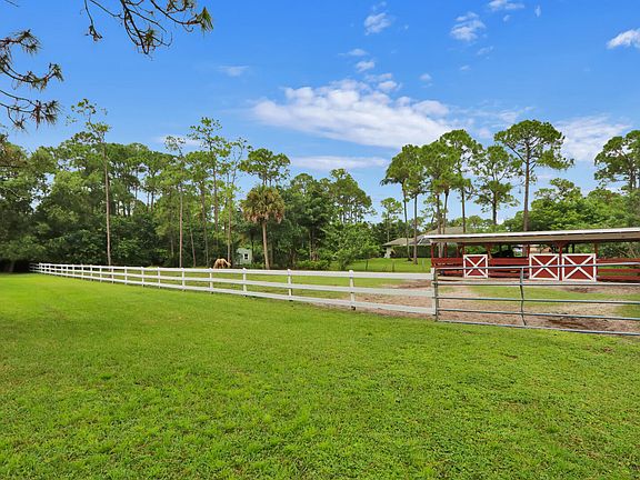Spacious 3 bedroom, 2 bath ranch style home on an oversized 2.06 acre lot with horse stables. The yard is completely fenced with a private gated entry and long driveway along the pond. As you enter the living area you will notice cathedral ceilings with skylights and real oak wood flooring. The kitchen featuring wood cabinetry and corian countertops overlooks the private backyard. All three bedrooms are spacious with a great master bedroom suite featuring upgraded wood flooring, a walk-in closet, and large master bathroom. Plenty of storage with the 2 car garage and detached storage shed that will remain for the new owner. The backyard is completely set up for the ''horse lovers'' with well designed stables and turnouts for the horses. Well maintained home on a paved road in Loxahatchee.
