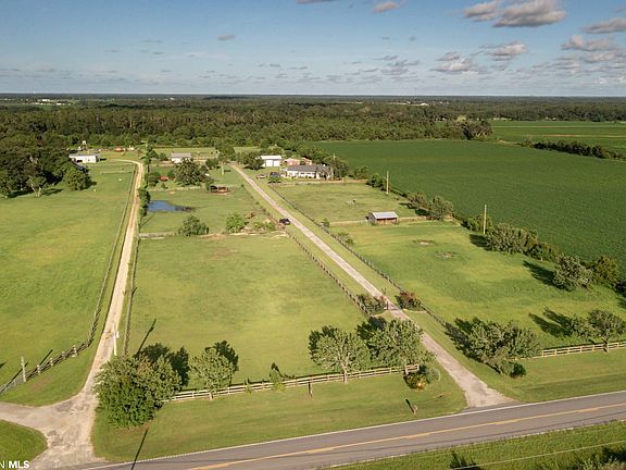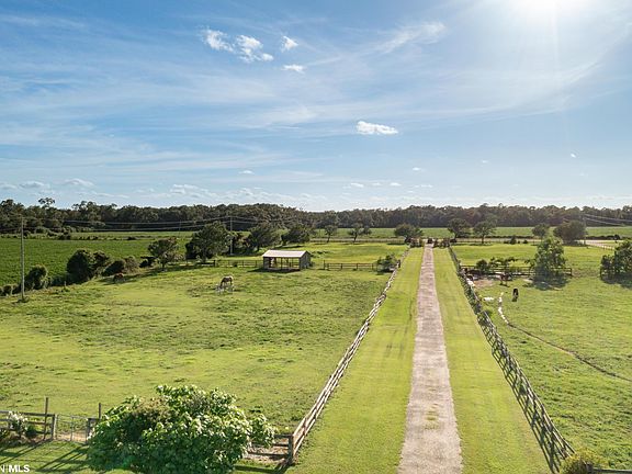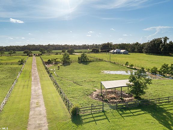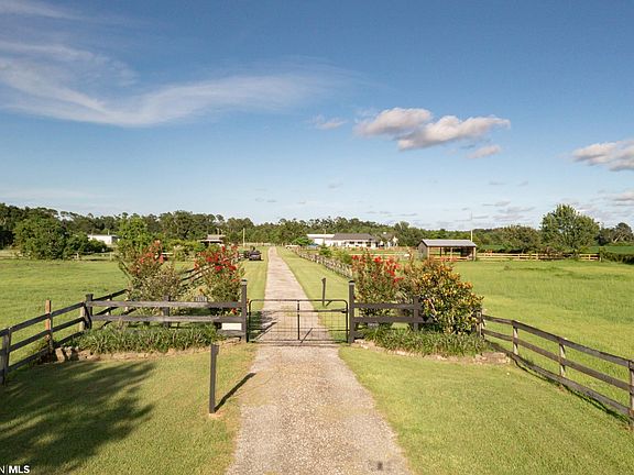 This home & surrounding property is a horse lovers dream! When you drive up to the property you will notice the electric gate for the entrance as well as the many beautiful pastures all around. There are almost 10 acres total, which includes an 1800 square foot 4 stall horse barn with a tack room, a lighted horse arena, paddocks, along with other storage buildings. Horse boarding is available in the front 2 pastures for extra income. There is also an RV hookup near the power pole and chicken coop on the property as well as a detached 3 car garage. The home is beautifully updated with the perfect farmhouse feel. Wainscoting, a gorgeous stone fireplace, and shiplap are just a few of the features you are sure to love! Let's not forget the oversized recreational room and roomy front porch. The appliances are all only a few years old and the roof is only 2 years old & is fortified. As far as location, this is perfect, so that you have the country feel but are also close enough to the things most people love about Baldwin County. It is only a 20 minute drive to downtown Fairhope and a 35 minute drive to the beautiful beaches of Gulf Shores! Schedule your showing today- this gorgeous property is ready for it's new owners!