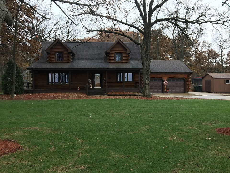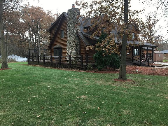 Beautiful 2 story log cabin in a wooded area in the country with a wrap around porch, concrete driveway, brick front sidewalk, color stamped back sidewalk, 22 ft high cathedral ceilings, rock fireplace with whole house heatalator, an open loft with 2 closets, a master bed /bath with walk in closet, double vanity, and jacuzzi tub. Finished basement with 2 bedrooms & a 1/2 bath, a living room area, & storage area with access to garage! Also includes a Generac 8KW generator!
