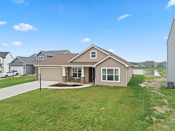Better-than-new 1596 SF Ranch on a pond lot on a cul de sac in Southwest Fort Wayne. Enjoy the serene pond views from the back patio with Pergola, or sip your morning coffee on the covered front porch. The open concept kitchen offers upgraded white cabinets with soft close doors and drawers, a deluxe gas range, corner pantry, island sink and dishwasher, and fully vented hood. This Lancia Yorktown floorplan with 3 arched entryways was built in 2021 offers 3 bedrooms, and 2 full bathrooms. The walk-in storage on the main level is a 6x5 room full of shelves. The great room has a trey ceiling with ceiling fan, and a gas log fireplace. Split bedroom floorplan- Master bedroom has a ceiling fan and walk in closet, and the bath has a tile flooring, & tile shower with 1' seat and door! Luxury Vinyl Plank flooring is the hard surface flooring elsewhere. Attached 2 car garage has pull down steps to floored attic storage. The garage shelves will remain, and there is pegboard on the walls. Award-winning school district. Don't miss this one!!