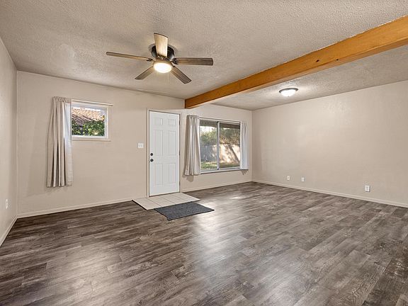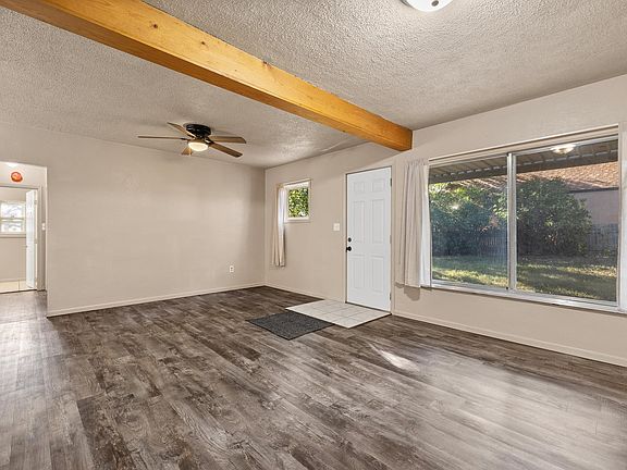 Mature treesFresh interior paintOff street parkingCovered patioBlack appliancesCorner kitchenVinyl flooring