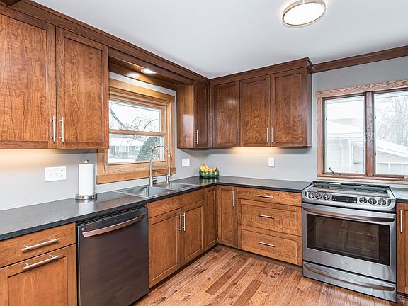 Great location in established neighborhood and lots of updates! Spacious four bedroom ranch boasts a newly remodeled kitchen with beautiful new cabinetry, stainless steel appliances, and custom designed center island with storage. The large windows provide an impressive flow of natural light as well as great views of the upper and lower decks and fully fenced backyard. Two bedrooms are located on the main floor; two on the walkout lower level. The heated workshop is just steps from the lower deck. There are plenty of large closets throughout the home for great storage. New roof installed in 2022. Oversized 2 car garage with loft for additional storage.