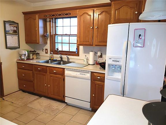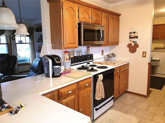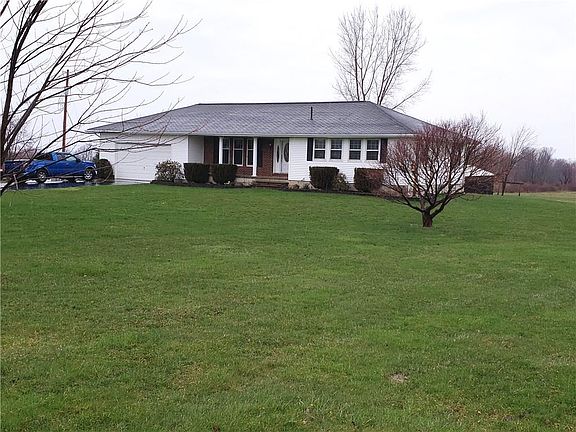 Country living. This one owner, custom built, 3-bedroom/1.5-bath ranch has been well maintained. It features oak kitchen, walk-in pantry, lazy Susan; ceramic tile floors in kitchen and dining room; large living room; Berber carpeting; main-floor laundry; master bedroom with master bath, Corian countertop and Corian walls in tub area, pocket doors; ceiling fans in all bedrooms; brick and vinyl exterior; hard wired smoke detectors; full dry basement with high ceilings, poured walls, glass block windows; central air; back deck with Trex flooring; attached 2.5-car garage; 24 x 40 pole barn; 200 amp electric service; double wide black top driveway; all kitchen appliances and washer/dryer stay. All of this on 10 acres (4 acres open and approx. 6 acres wooded) with a small pond. Call soon.