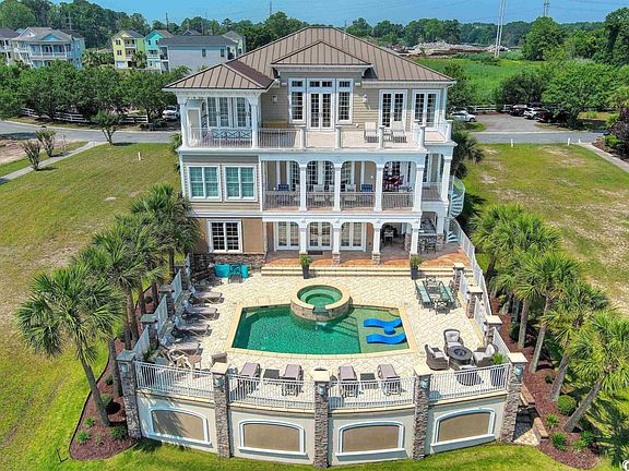 Welcome to 1318 Marina Bay Drive, an extraordinary waterfront custom built home in North Myrtle Beach that offers a luxurious coastal lifestyle overlooking the Intracoastal Waterway. This stunning home presents a seamless fusion of elegance, comfort, and breathtaking water views. Upon entering, you'll be captivated by the open and spacious floor plan, accentuated by a custom staircase that leads to the home theater. Ascend the staircase, and at the top, you'll be greeted by a magnificent Water feature, adding a touch of tranquility to the surroundings. The expansive living area boasts high ceilings, exquisite finishes, and large windows that frame the panoramic vistas, creating a warm and inviting ambiance for both entertaining guests and relaxing with your family. The gourmet kitchen is a haven for culinary enthusiasts, featuring top-of-the-line Miele stainless steel appliances, custom cabinetry, and a generous bar counter that serves as a gathering spot for casual dining. Adjacent to the kitchen, the breakfast area offers a seamless transition between indoor and outdoor living, with glass doors leading to your very own oasis. Step outside onto the patio, where you'll discover a private pool and hot tub, perfect for refreshing swims and soothing relaxation. Adjacent to the pool, you'll find a beautifully designed outdoor kitchen and BBQ area featuring another water feature, ideal for culinary enthusiasts and social gatherings. Bask in the sun-drenched deck while enjoying the mesmerizing water views, or gather around the poolside and make lasting memories as you savor delicious grilled delicacies and host unforgettable celebrations. Enter the house from the pool area on the ground floor and immerse yourself in a meticulously designed space dedicated to relaxation, entertainment, and indulgence. The focal point is an impressive bar, perfect for gathering with friends and enjoying lively conversations. Adjacent to this room, you'll find a convenient pool bathroom and one of two laundry rooms. Further exploration leads you to a stylish and comfortable guest suite, providing a private oasis for overnight visitors. Whether you're hosting a game night, celebrating a special occasion, or simply seeking a space to unwind, this house offers the perfect blend of entertainment, comfort, and luxury. The top deck of this magnificent residence offers breathtaking views. Step onto the spacious outdoor area and immerse yourself in the captivating panorama of the surrounding landscape. Relax in the cozy seating area, complete with a fireplace for warmth and ambiance. An outdoor TV allows you to enjoy your favorite shows or thrilling sports events while taking in the natural beauty. With stunning views and a crackling fireplace, this top deck is an ideal spot to unwind, entertain, and create unforgettable moments with loved ones. The master suite is a private retreat that offers tranquility and comfort. Wake up to breathtaking sunrise views and indulge in the luxurious ensuite bathroom, complete with a spa-like soaking whirlpool tub, a spacious walk-in shower, and dual vanities. The home also features several well-appointed guest bedrooms and bathrooms, ensuring that everyone has their own space and privacy. Situated in North Myrtle Beach, this residence is located in a highly sought-after neighborhood renowned for its proximity to the Intracoastal Waterway, marina, pristine beaches, championship golf courses, and an abundance of dining, nightlife and entertainment options. During the summer season, your outdoor area will feel like a front row seat to local live entertainment across the water. Whether you're seeking a permanent residence or a vacation getaway, Marina Bay offers the epitome of coastal living. Don't miss out on this exceptional waterfront property. Schedule your private showing today and experience the allure of 1318 Bay Marina Drive in North Myrtle Beach firsthand. Your dream coastal lifestyle awaits!
