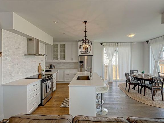 Don't miss this rare opportunity to own a modern home on a 12,000sqft lot in Fox Hollow. This property offers more than double the land of other homes in the area – so there's plenty of space to add a pool or anything you desire without sacrificing greenspace. Floor-to-ceiling windows on the main level and master bedroom offer breathtaking views of the yard and an abundance of natural light. The kitchen features wood cabinets that extend to the ceiling, a large island, Carrara marble backsplash,& a walk-in pantry. You'll enjoy tons of upgrades, including hardwood flooring, premium grade quartz countertops, glass showers, and wood cabinetry throughout the home. Each of the home's 4 bedrooms has an ensuite or assigned bathroom, so there's no need to share! The 2nd level includes a large primary bedroom with oversized ensuite and walk-in closet, a convenient upstairs laundry room, a covered balcony,& an open concept family room which could be converted to an additional bedroom. The basement has been professionally finished with city permits and features a rec room, wine bar, bedroom, bathroom, & office. The yard is fully fenced and includes a deck and a shed to store your outdoor items. I am confident you will love this elegant, modern home in a family-friendly community. Close to all the great amenities Fox Hollow has to offer; restaurants, shopping, schools, walking paths,& less than 10 mins to UWO and 15 mins to downtown London. The house is zoned for 2 newly constructed elementary schools