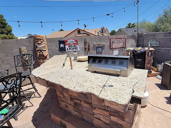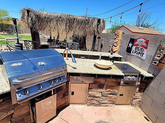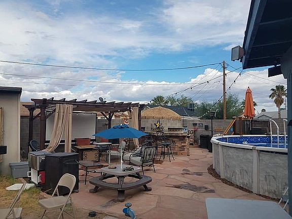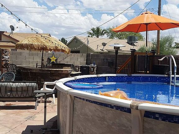 Home was repainted and new roof in 2016 and metal over all pillars and siding, full outdoor kitchen bbq area, back yard oasis, garage rebuilt in 2021. New insulation, duct cleaning done 7/2. Big storage shed 12x12. Has a semi inground 21ft pool.