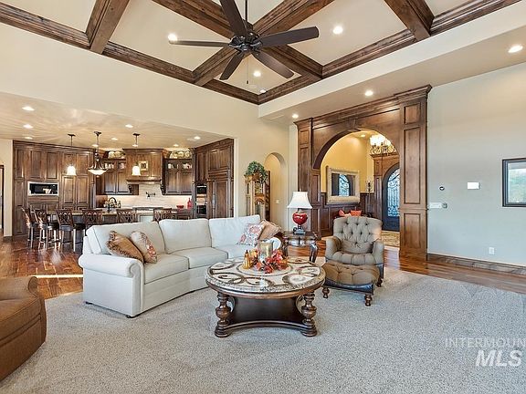Welcome to a slice of paradise nestled in the sought-after community of The Shores. This striking residence, set against the tranquil backdrop of a serene pond and majestic mountain views, offers an unparalleled blend of natural beauty & upscale elegance. The home’s impeccable custom finishes leave an indelible impression of sophistication. Large Chef's kitchen with Wolf appliances, Sub-Zero fridge & a hidden pantry with an additional fridge, wine fridge & sink. The sprawling primary bedroom suite is located on the main level.Its heated bathroom floors promise a cozy start to every day, ensuring maximum comfort during the colder months. Also on the main level, 2 additional bedrooms, each boasting their private en-suites, making them perfect for family or guests. Upstairs consists of 2 more bdrms & a bonus room.For those who require ample storage or have an RV, the large 4-car garage can easily double as a 2-car garage with an RV bay. House is equipped with a Control 4 system, simplifying home management.