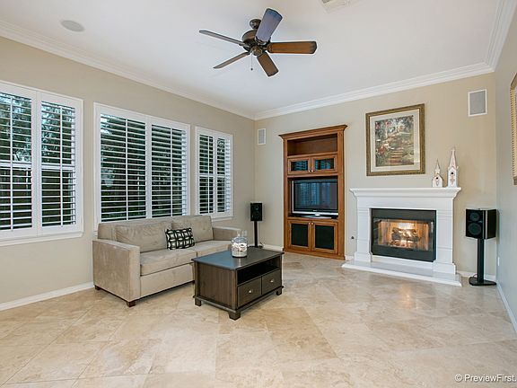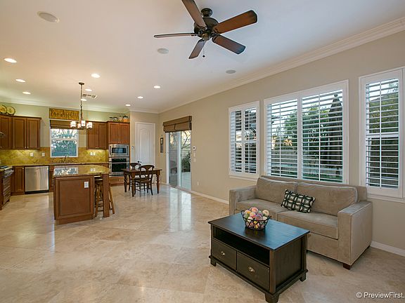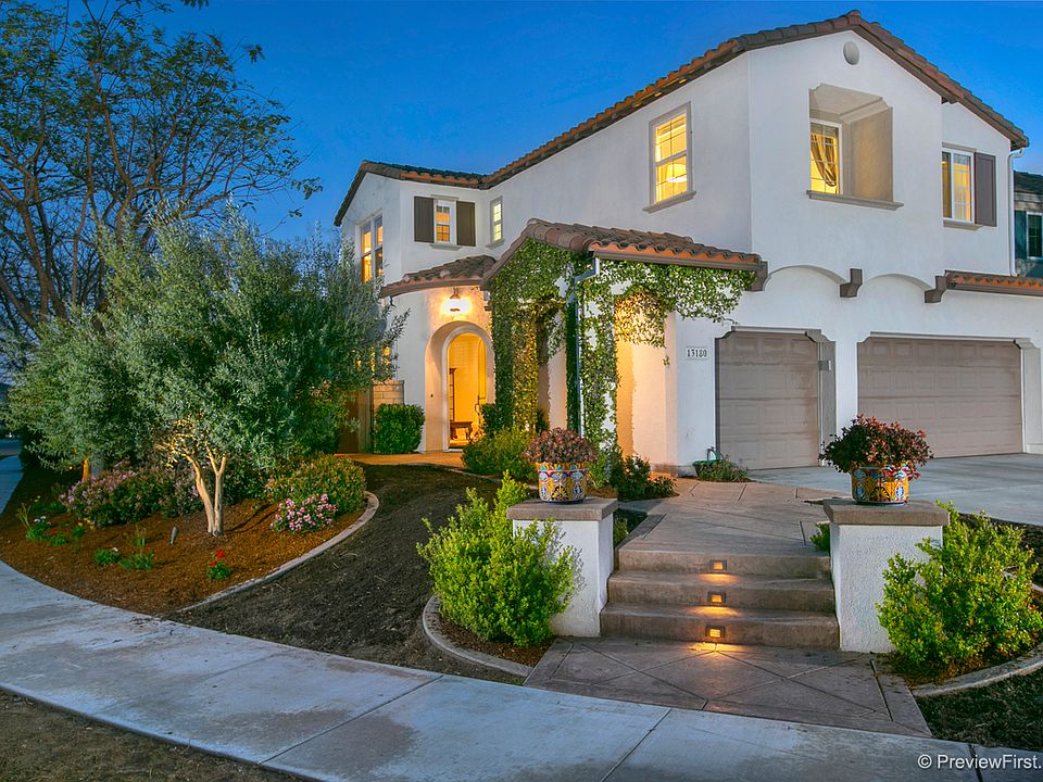 This wonderful Soleil, cul-de-sac location home, with impressive approach and curb appeal awaits you. This ideal family home boasts granite counter tops/stainless steel appliances and a high volume exterior vented hood in kitchen, salt water pool, 10 person spa, built-in barbeque, fire pit, surround sound in family room, distressed hardwood floors, and more. Come home and unwind in the elegance of having crown molding throughout, custom light fixtures, plantation shutters, and travertine floors. Your wallet will be impressed by the savings of having solar for your pool. You and your guests will appreciate the convenience of having a bedroom and full bath on the first floor. Also, the amenities of Pacific Highlands Ranch Recreation Center will be sure to make a family event fun; these amenities include: Junior Olympic size pool, spa, water play area for kids, fitness room, club room, multi-purpose room, and covered outdoor room with a two-sided fireplace. Other features include: 1. Overhead garage storage 2. Epoxy flooring in garage 3. Den-Media room 4. Tank-less water heater 5. Walk-in closet in second bedroom 4 Bedrooms + Loft, 3 full Baths, and 2,730 Square Feet