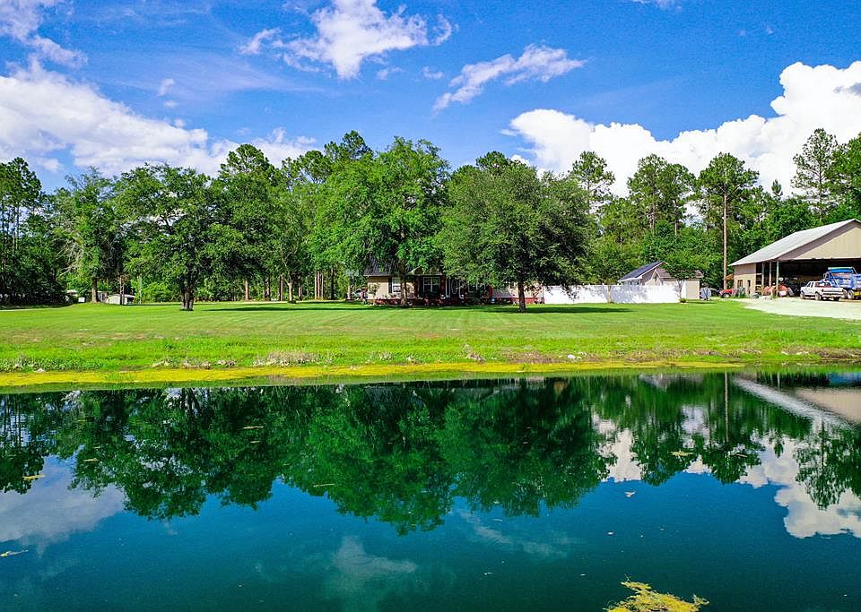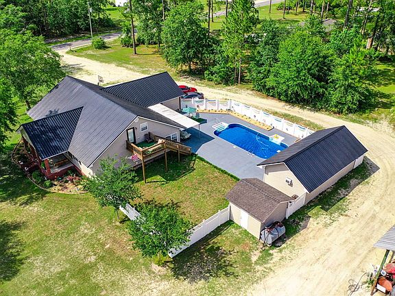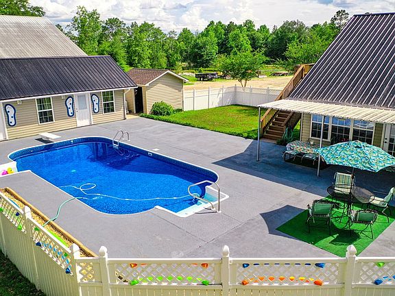 This wonderful property has a lot to offer. As you drive toward the beautiful 2 story, 4BR/3 1/2 bath home, situated on 2.37 acres, you will pass the stocked pond that the front porch overlooks. The first floor of the home features 2 guest bedrooms as well as the master and 3 full baths. Kitchen offers stainless appliances and a very large bar for additional seating. Upstais is a large bonus room, another BR and 1/2 bath.This area has its own entrance/exit by a nice wooden balcony and stairs overlooking the pool area and back yard. The main floor has open floor plan w/kitchen, dining,and living room flowing out onto the lovely sunroom that overlooks large covered patio, pool, and pool house This home is great for entertaining! .NEW POOL LINER.Home and pool house both have NEW ROOFS. 16x32 pool house has a full bath w/tankless water heater and large open room w/AC (wall unit) Additional 44x56 shop has 1/2 bath and office area inside w/ a lean to out back. Property has 2 septics.