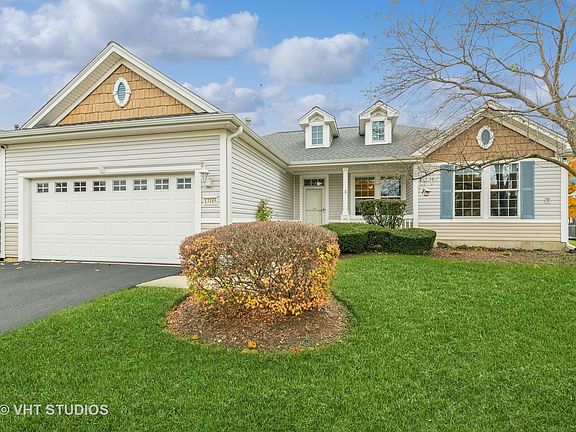 Well Maintained Mackinac Model with Three Seasons Room Situated On A Nice Sized And Nicely Landscaped Lot. Conveniently Located Close To Del Webb's Prairie Lodge! This Home Features a Charming Front Porch, Hardwood Floors, Custom Light Filtering Window Treatments Throughout. Primary Bedroom Features Customized Walk-In Closet & Private Bath with Whirlpool Tub and Separate Shower. Large, Fully Applianced Kitchen with White Extended Cabinets Leads To The Three Seasons Room with Opening to Paver Brick Patio. Laundry Room with Washer Dryer Included Plus Utility Sink. Then There's the Bonus Room which Would Make a Great Home Office/Play Room/Sewing Room, Etc! 2 Car Attached Garage With Hanging Storage Racks. Driveway 2022, Furnace, A/C, Water Heater 2018, Roof 2020, blinds 2022. Lawn irragation System, Security System with Alarm, Fire Alarm, Cameras. Del Webb Sun City Huntley is an active adult ( 55+) community. Come enjoy the many amenities available such as Golf Course, Pickle Ball, Tennis & Bocce Ball Courts, Clubhouse 3 Pools, 2 Fitness Centers, Classes, Wood Shop, Walking Trails, Nature Park, Pond and numerous clubs. Close to shopping, restaurants, Jameson's Charhouse and interstate access!